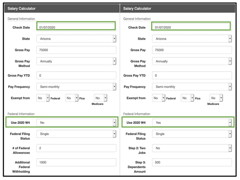 Two side by side 2020 check date calculations are shown below. The calculator on the left has the 2019 W-4 selected whereas the calculator on the right has the 2020 updated W-4 with automatically adjusted fields. This selection is done via the "Use 2020 W-4" drop down field within the calculator.